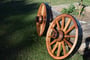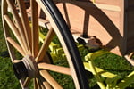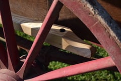 Des coins en bois d'acacia viennent bloquer les tenons et ainsi la roue en blanc (c'est à dire la roue en bois non ferrée).