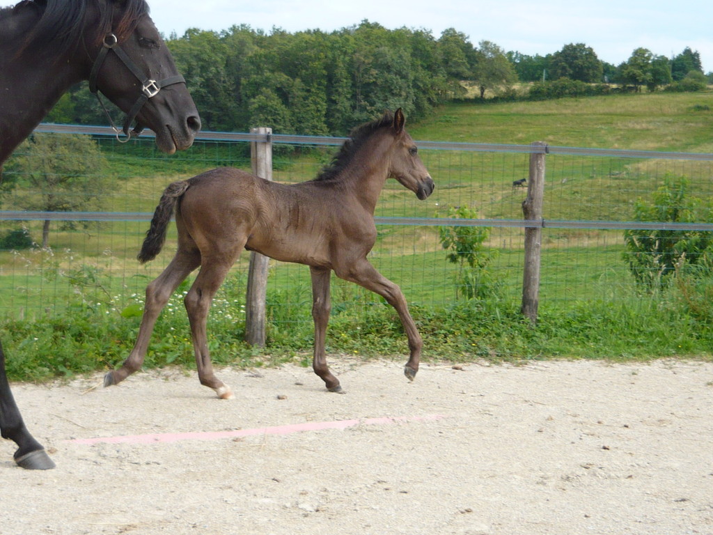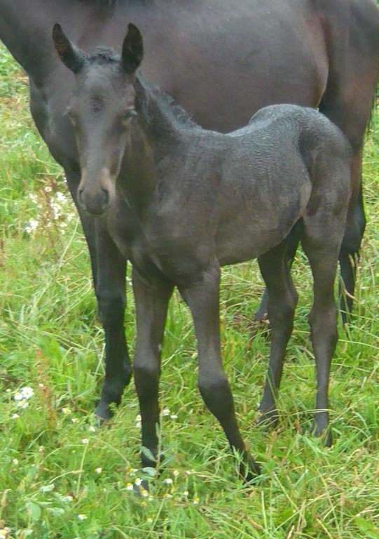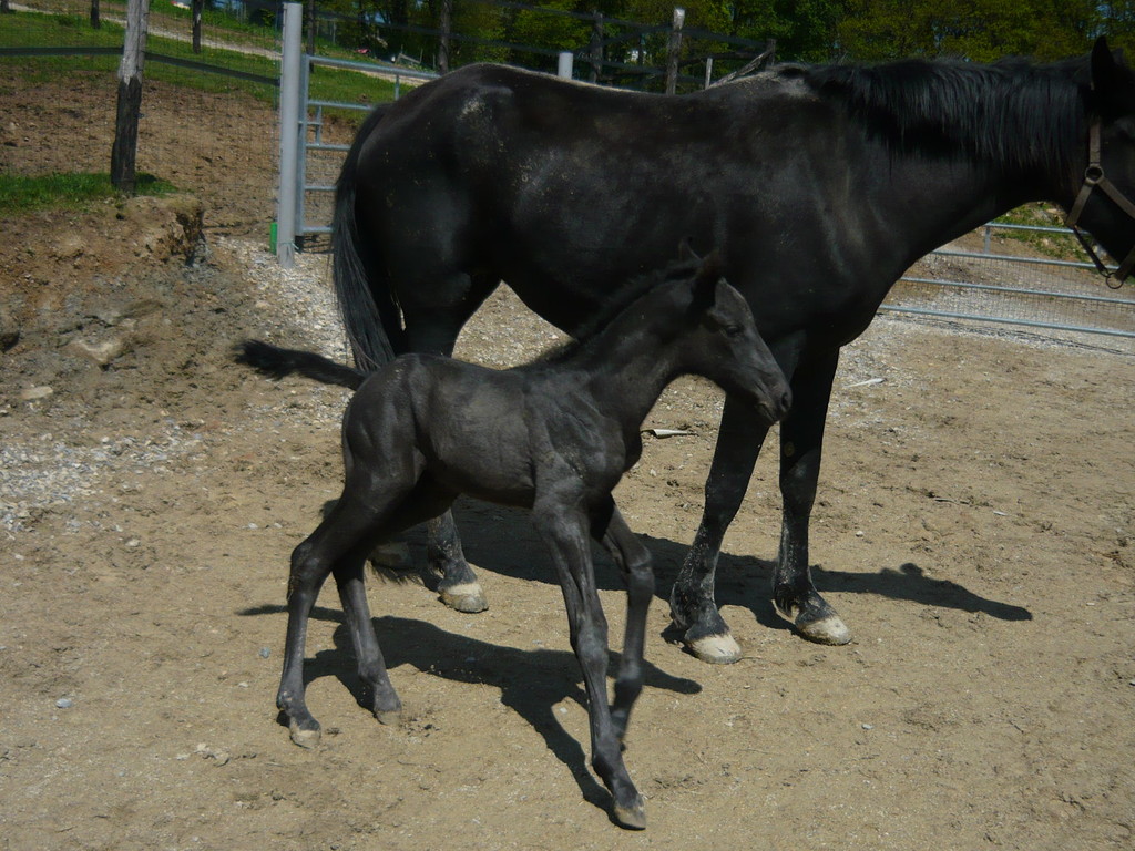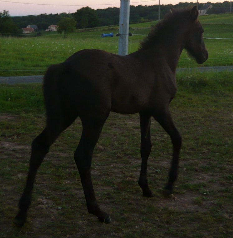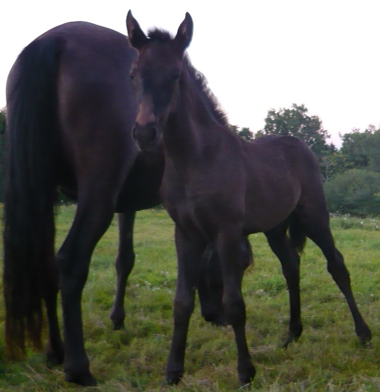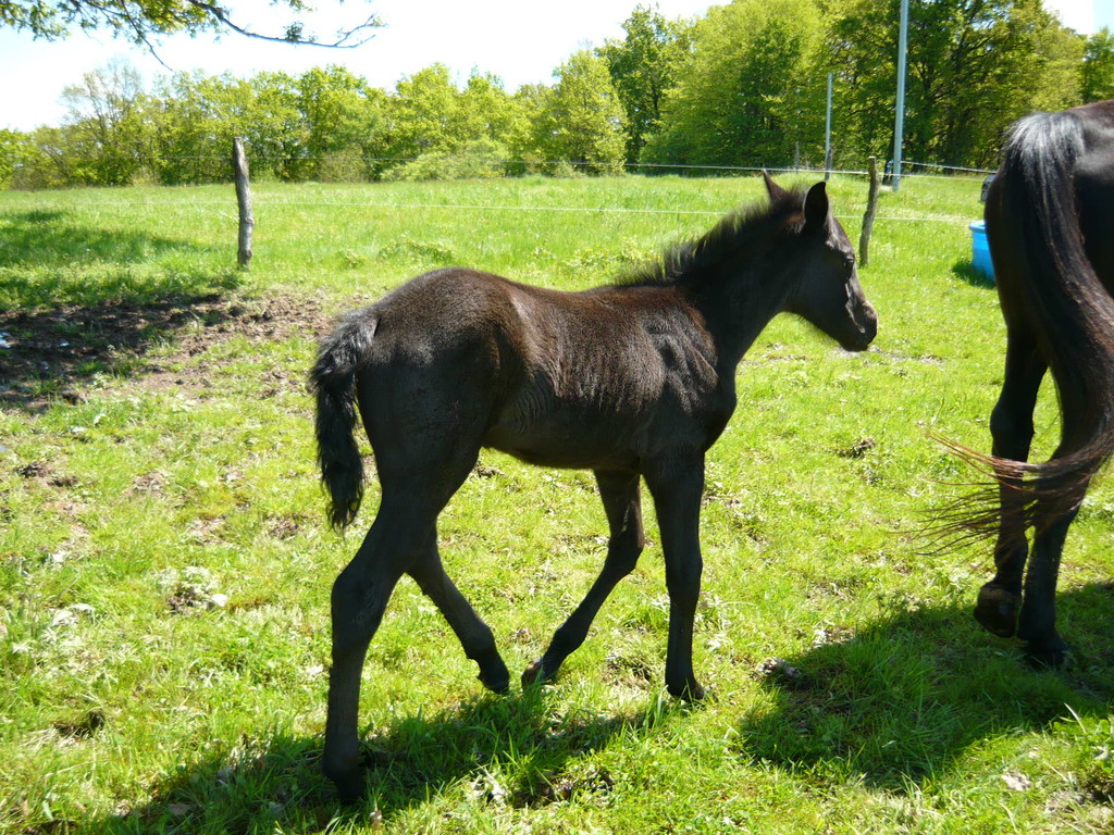 Poulain pleins papiers né le 3 mai 2010, le dernier né pour cette année... mais le premier fils de Suker, notre étalon et de Sinia, notre poulinière. Trés grand poulain (sa mère Sinia mesure 1,70 m) et entièrement noir.
